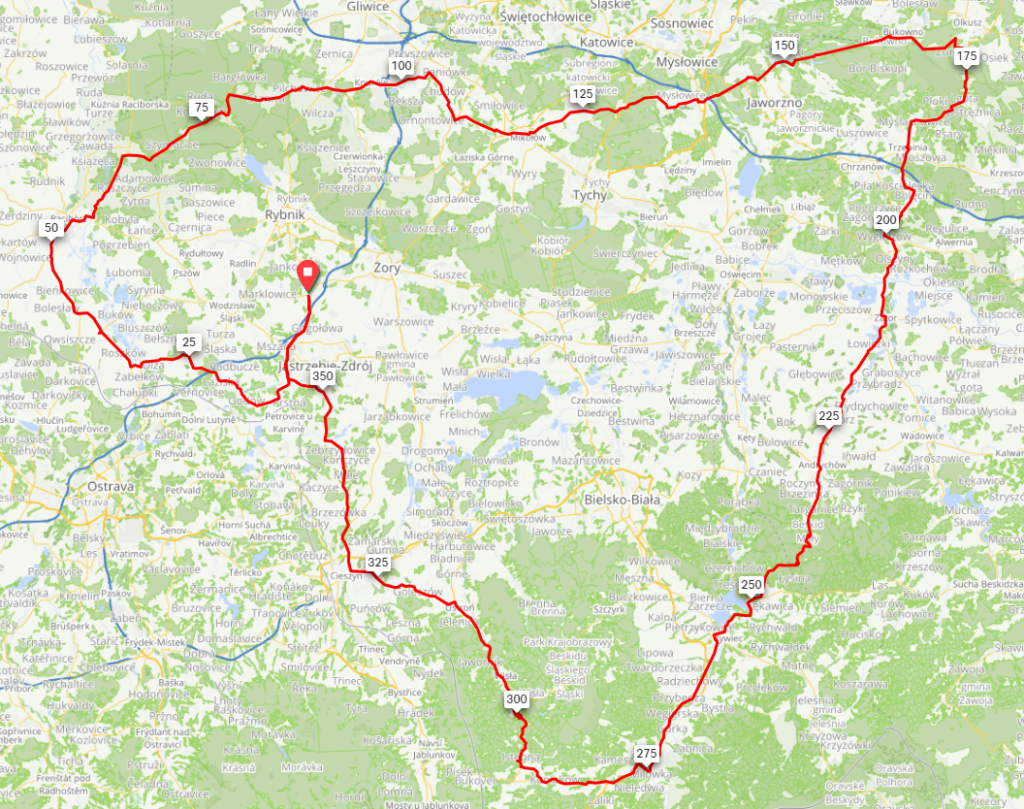 Pomimo późnej pory roku, pogoda dopisała. Za dnia było ciepło i słonecznie. Jedynym utrudnieniem był mały spadek temperatury nocą oraz lokalne opady deszczu, które spotkały coniektórych zawodników na trasie. Podobnie jak przed rokiem, rywalizacja odbywała się na trzech dystansach: 100 km, 300 km oraz 500 km. Na ostateczny wygląd tras, również wpływ miała pandemia. Z powodu obostrzeń niemozliwy był wjazd na terytorium Republiki Czeskiej, więc trasa została poprowadzona w 100% po terytorium Polski. Pomimo tego, zawodnicy nie mogli narzekać na brak widoków oraz sporą ilość podjazdów 🙂
