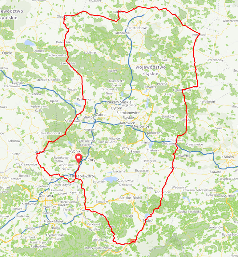 Jak co roku, jako pierwsi na trasę ruszyli zawodnicy najdłuższgo dystansu. Start odbywał się z podziałem na kategorię SOLO oraz OPEN. Po pagórkach w okolicy Cieszyna oraz Bielska Białej, zawodników czekało pierwsze wyzwanie – podjazd pod przełecz Salmopolską. W nagrodę, po szybkim zjeździe każdy mógł odpocząć na punkcie kontrolnym w Wiśle Malince. Na zawodników czekał arbuz, banany, zupka i oczywiście zimne napoje. Kolejne kilometry to podjazd pod Kubalonkę, Koniaków oraz Kocierz, na szczycie którego znajdował się kolejny punkt kontrolny. Po uzupełnieniu bidonów na zawodników czekał stosunkowo płaski odcinek do Bolęcina, gdzie w zajeździe Nawsie na każdego czekała pyszna zapiekanka. Wraz z kolejnymi kilometrami na trasie zapadał zmrok oraz pojawiły się podjazdy w rejonie Jury Krakowsko-Częstochowskiej. Przedostatni punkt kontrolny znajdował się w Rogoźniku, gdzie na zawodnikó czekała miła obsługa oraz pyszny makaron. Ostatni etap był stosunkowo płaski, lecz przy olbrzymim zmęczeniu kilometry potrafią się bardzo dłużyć. Dla zabicia monotonii uczestnicy podjechali Górę Świętej Anny, a następnie zjechali na ostatni punkt kontrolny do Żyrowej. Tam przy muzyce i ognisku mogli naładować siły na sotatnie kilometry w kierunku mety. W Godowie na każdego czekał pamiątkowy medal oraz tradycyjny już Śląski Obiod 🙂