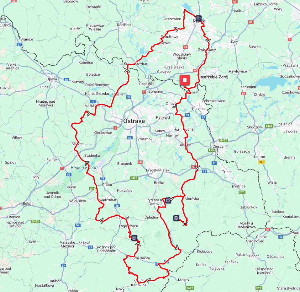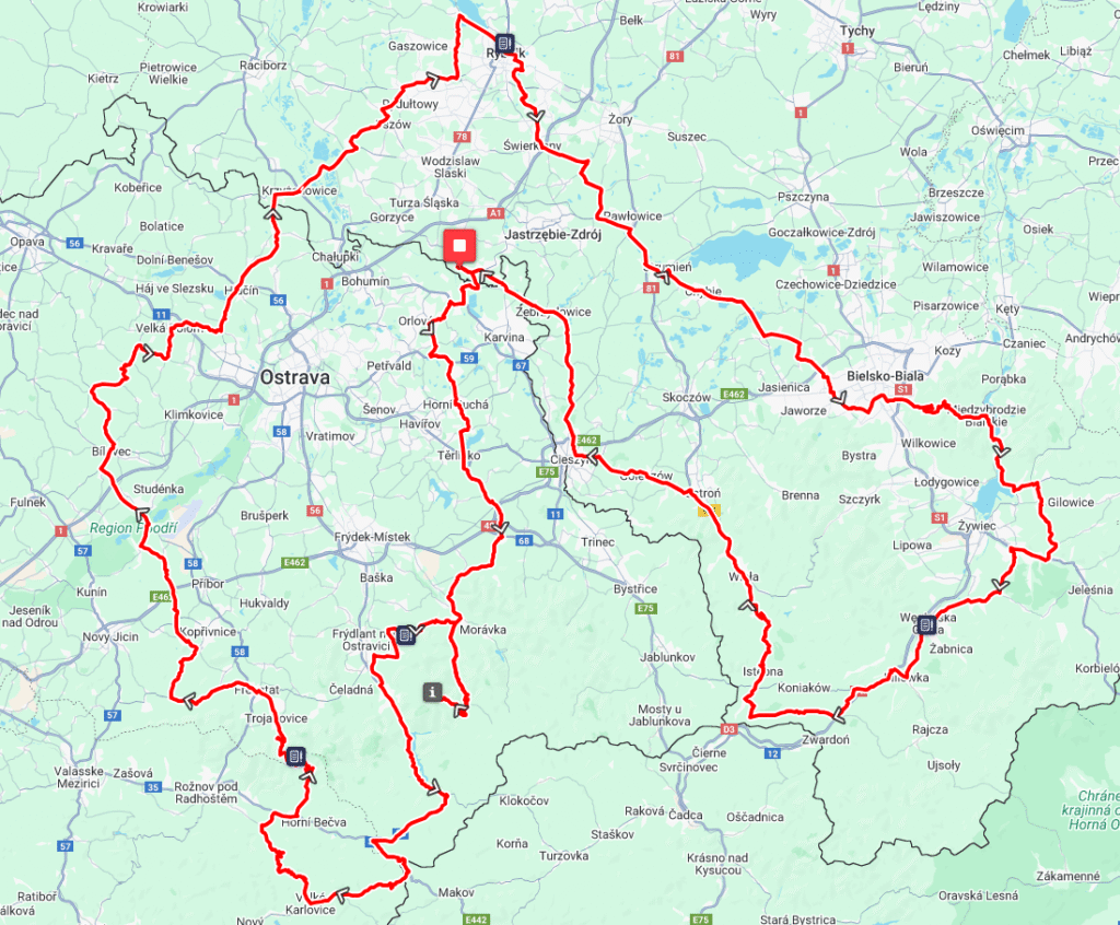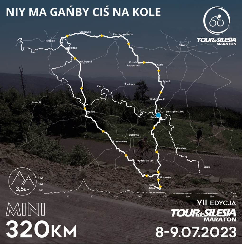 Po zawodnikach dystansu CLASSIC, na starcie pojawili się śmiałkowie z dystansu MINI. Czekała na nich trasa o długości 330 km, która liczyła aż 4700 m przewyższenia. Podobnie jak na najdłuższym dystansie po pierwszych płaskich kilometrach, zawodników czekał podjazd na najwyższy punkt tegorocznej edycji – Łysą Horę (1323 m). Długi, mozolny podjazd, świetne widoki i w nagrodę szybki zjazd na punkt kontrolny. Następne kilometry to kopia trasy z dłuższego dystansu, poza jednym fragmentem. Drugi punkt kontrolny rówież znajdował się na przełęczy Pustevny. Tam na wysokości 1010 m, na zawodników czekały zimne napoje oraz pyszny obiad. Po którkim odpoczynku czas na zjazd leśną ścieżką, przeznaczoną tylko dla rowerów. Najtrudniejsze kilometry pokonane 🙂 Kolejne kilometry to pagórkowate tereny z widokami na zamek w Stramberku czy malowniczy Bilovec. Po przekroczeniu granicy trasa biegła przez Syrynię w kierunku Rybnika, gdzie zlokalizowany był kolejny punkt kontrolny. Był on wspólny dla wszystkich dystansów i mieścił się przy stadione żużlowym w Rybniku. Z tego miejsca dla dystansu MINI pozostała ostatnia prosta w kierunku mety, gdzie na każdego czekał pamiatkowy medal i pyszny, Śląski Obiod 🙂