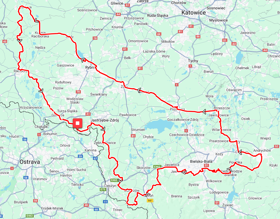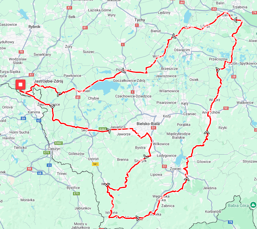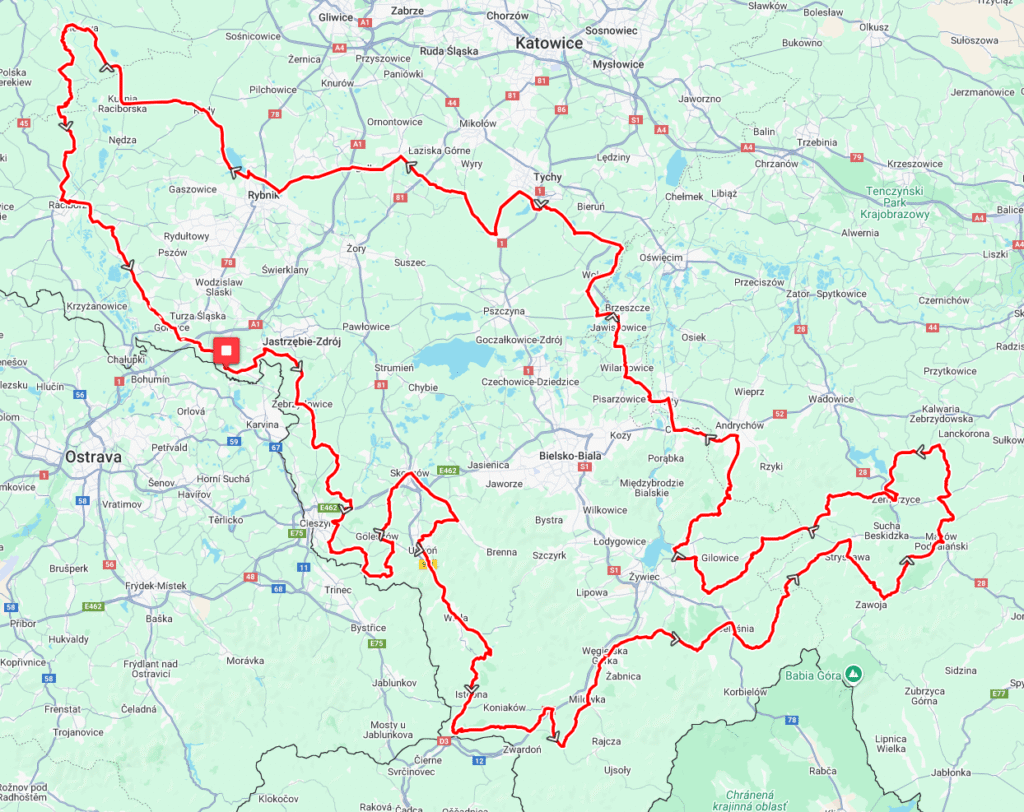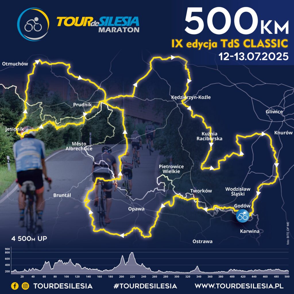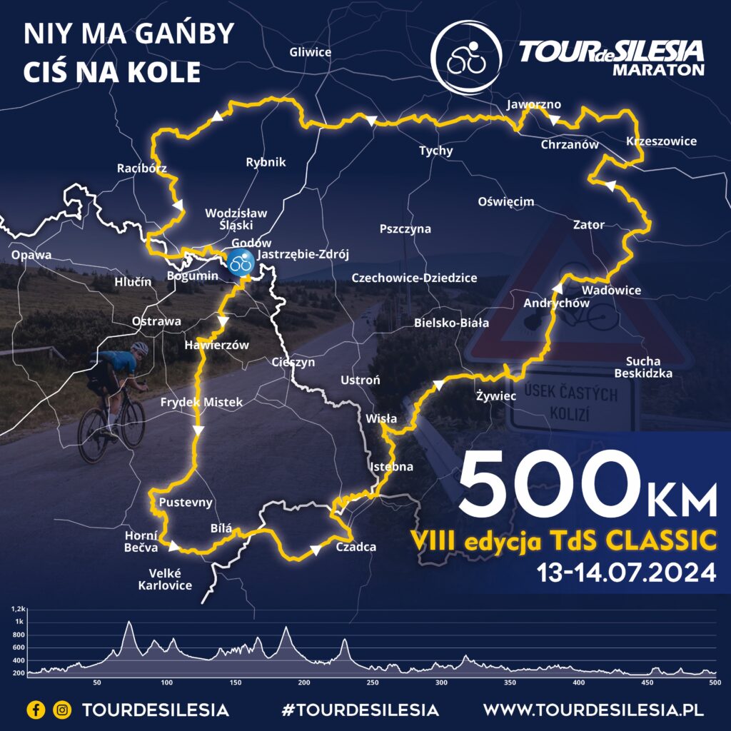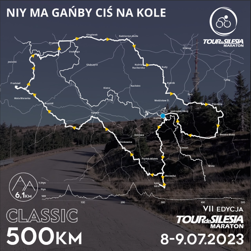 Równo o godzinie 7.30, po krótkiej odprawie technicznej, na trasę 500 km rusza pierwsza grupa. Starty odbywają się co 5 min po 10 osób. Wpływ na taką formę startu maja przepisy o ruchu drogowym, których zawodnicy muszą przestrzegać, gdyż cały maraton odbywa się w ruchu ulicznym. Na dystansie 500 km wystartowało niespełna 80 śmiałków. Na pierwszych kilometrach czekały na nich małe podjazdy na drodze w kierunku Cieszyna. Kulminacyjnym punktem tego odcinka był bardzo stromy podjazd na przełęcz „Pod Tułem”. Łatwo nie było, lecz widoki wynagradzały trud. Następnie szybki zjazd i odpoczynek na pierwszym punkcie kontrolnym w Górkach Wielkich. Na dłuższym dystansie zawodnicy musieli zaliczyć 5 punktów. Obecność na nich jest obowiązkowa. Dodatkowo, uczestnicy mogą uzupełnić swoje bidony, zjeść batona, wypić kawę czy też posilić się zupą lub drugim daniem. Wszystko tak, aby spokojnie mogli pokonać kolejne kilometry. Drugi odcinek trasy tegoż dystansu można śmiało nazwać górskim. Śmiałków czekały podjazdy pod zameczek w Wiśle, Jaworzynkę oraz Laliki. Kolejny punkt kontrolny czekał na kolarzy w Węgierskiej Górce. Tam mogli liczyć na sporych rozmiarów kotleta z ziemniakami i surówką. Następne kilometry to dalej góry, które prowadziły w stronę Makowa Podhalańskiego do restauracji Kardamon, gdzie każdy mógł zjeść pyszną zupkę przed rozpoczęciem bardzo trudnego podjazdu. Nagrodą za jego pokonanie była widokowa trasa wzdłuż zbiornika Świnna Poręba. Ostatnim górskim wyzwaniem na trasie był podjazd pod Kocierz. Z tego miejsca, pozostało już raptem płaskie 200 km do mety. Ale najpierw szybki punkt na bardzo dobry obiad w Kętach. Końcowe 200 km zawodnicy pokonywali już nocą. Dzięki temu ruch w pobliżu takich miejscowości jak Tychy, Kobiór czy też Orzesze był znikomy. Ostatnia pauza na trasie miała miejsce w Rybniku nad zalewem. Po zjedzeniu zupy pomidorowej, pozostało ostatnie 100 km, wiodące po terenach w okolicy Raciborza. Na deser jeszcze podjazd pod Pogrzebień i ostatnia prosta do mety. Ogromne gratulacje dla wszystkich, którzy pokonali ten dystans!