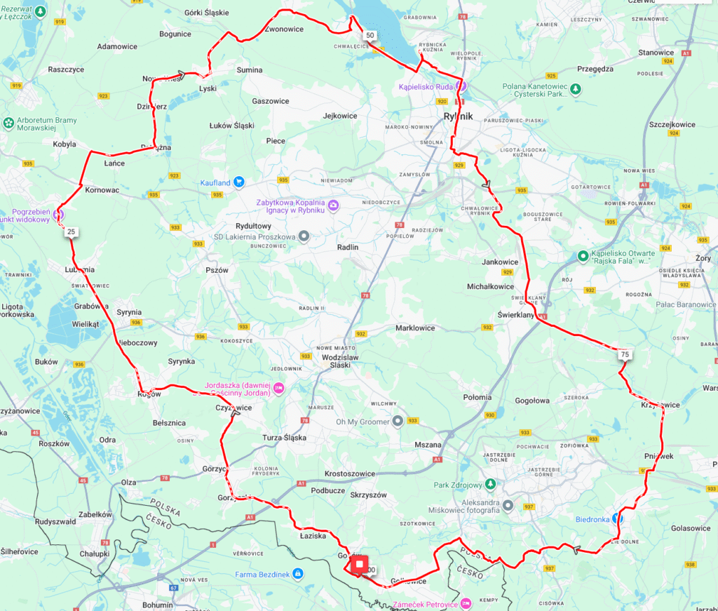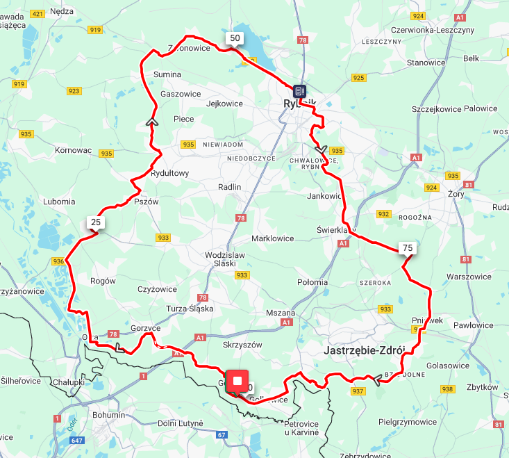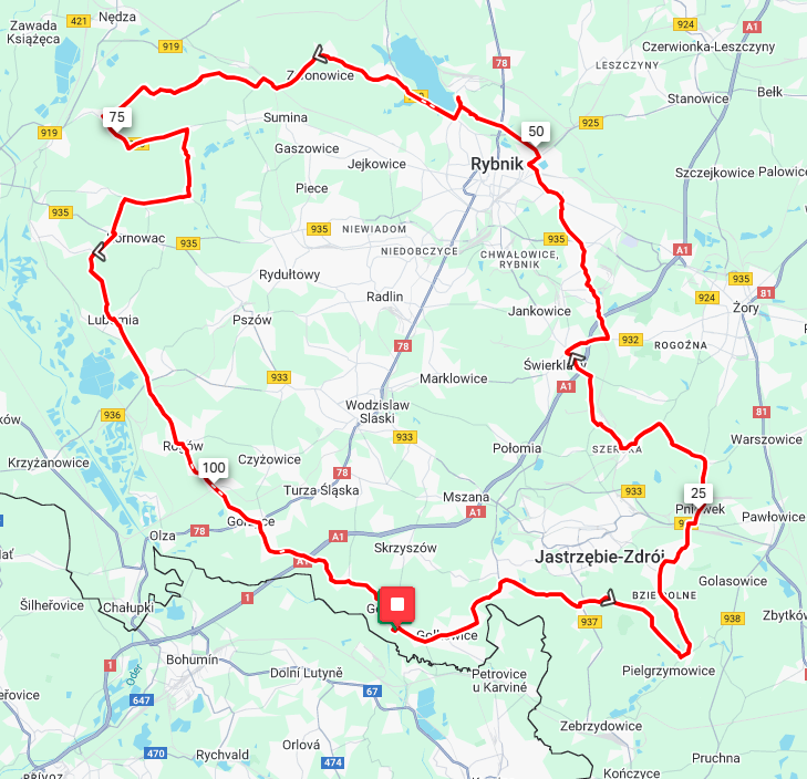 Śmiałkowie startujacy na trasie dystansu FAMILY, zameldowali się na obiekcie sportowym w Niedzielę. O godzinie 8.30 na trasę ruszili pierwsi zawodnicy. Czekało na nich pagórkowate 100 km. Pierwszym wyzwaniem był podjazd pod wieżę w Pogrzebieniu, skąd uczestnicy spokojnymi drogami skierowali się w stronę zalewu Rybnickiego. Punkt kontrolny znajdował się przy lokalu PALECIAK, w bezpośrednim sąsiedztwie zalewu. Po uzupełnienu kalorii oraz bidonów, zawodnicy przez Rybnik i Jastrzębie Zdrój dotarli do mety w Godowie. Tutaj pamiatkowy medal, Śląski Obiod i zadanie pokonania 100 km można uznać za wykonane 🙂
