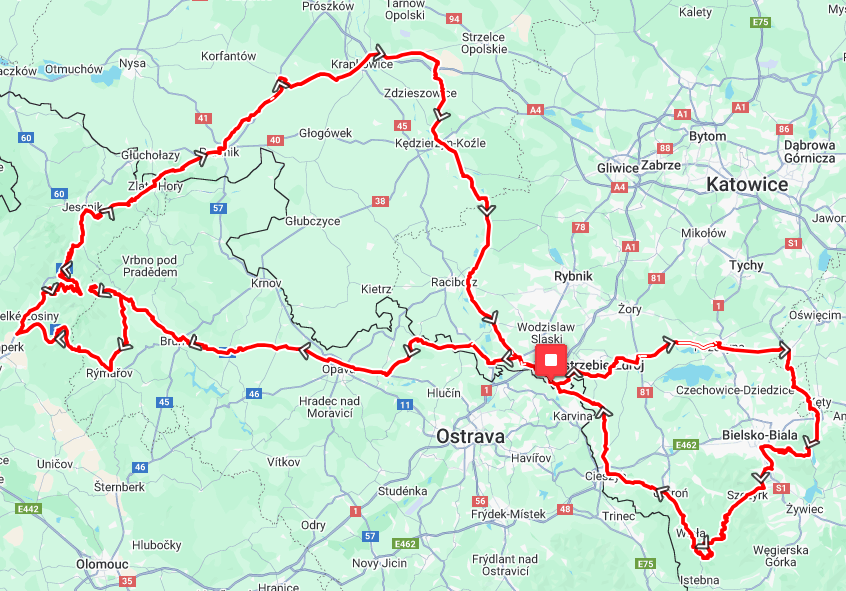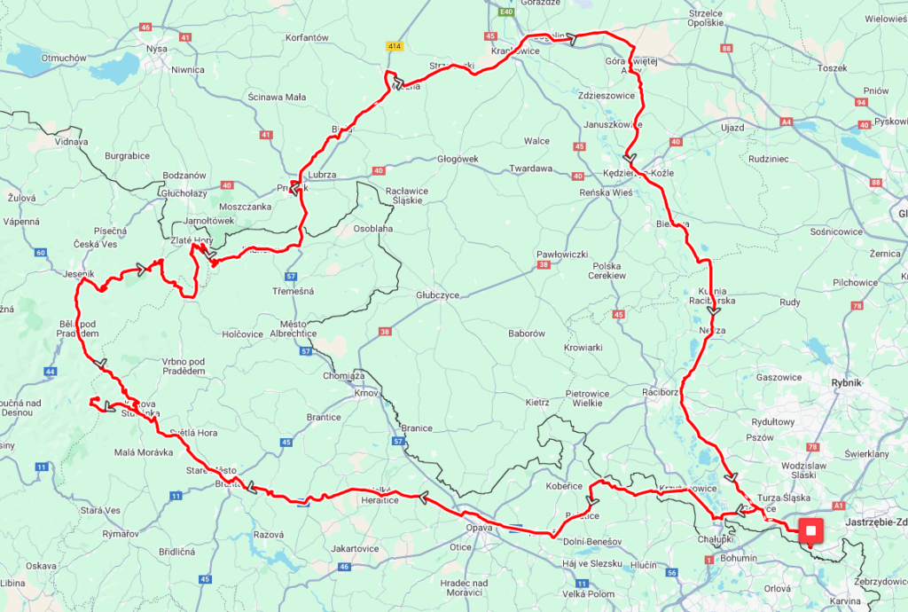 Pierw wspólnie podążyli w kierunku Opawy, skąd skierowali się na Burntal. Następnie zdobyli najwyższy szczyt pasma Wysoki Jesionik – Pradziad. Na parkingu, gdzie rozpoczyna się podjazd, czekał specjalnie przygotowany puntk kotrolny. Można było uzupelnić bidony, zjeść kołoczka oraz zabrać batona w trasę. Kolejne kilometry, to walka z licznymi podjazdami, którymi były naszpikowane tegoroczne trasy. W nagrodę, na każdego czekał ciepły obiad i chwila wytchnienia na punkcie kontrolnym w Prudniku. Potem ostatnia prosta, przejazd przez Gogolin, wspinaczka na Górę św. Anny, Kędzierzyn-Koźle i w końcu upragniona meta w Godowie dla dystansu 350km. Uczestnicy dłuzeszego z dystansów w Godowie mógli liczyć na kolejny ciepły posiłek w barze Aperitif oraz dobre warunki do szybkiego odpoczynku. Było to bardzo ważne, bowiem czekała ich jeszcze mordercza pętla po Beskidach, z podjazdami na Przegibek, Salmopol i Kubalonkę. Na zakończenie wizyta w Cieszynie i jazda w kierunku mety w Godowie. Po dotarciu na metę, każdy z zawodników otrzymał pamiątkowy medal oraz tradycyjny Śląski Obiod, który dla większości zawodników był zupełnie czymś nowym.