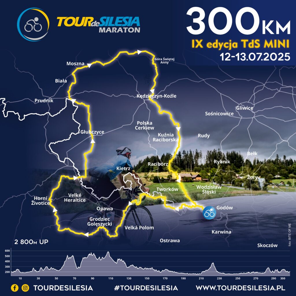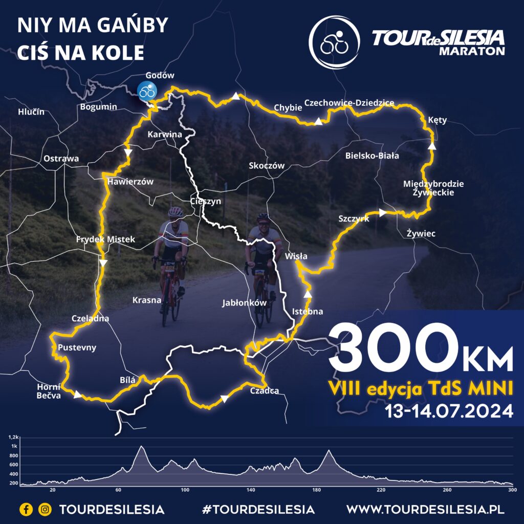 Dystans 300 km wystartował o godzinie 8:25. Trasa do punktu w Górkach Wielkich miała bardzo zbliżony przebieg do tej na najdłuższym dystansie. Następnie odbijała w kierunku Bielska Białej, gdzie po pokonaniu kilku mniejszych podjazdów na zawodników czekał Przegibek. Zdecydowanie największe wyzwanie na tej trasie. W nagrodę kilka kilometrów wzdłuż jeziora Międzybrodzkiego i kolejny mały, sztywny podjazd pod Wielką Puszczę. I w ten sposób uczestnicy pokonali największe trudności na trasie TdS MINI. W nagrodę posiłek na punkcie w Kętach i szybkie kilometry w stronę Rybnika a następnie na nadodrzańskich terenach za Raciborzem. Podjazd pod Pogrzebień, który po wcześniejszych podjazdach stał się tylko małą zmarszczką i meta w Godowie. Ogromne gratulacje dla wszystkich, którzy pokonali ten dystans!